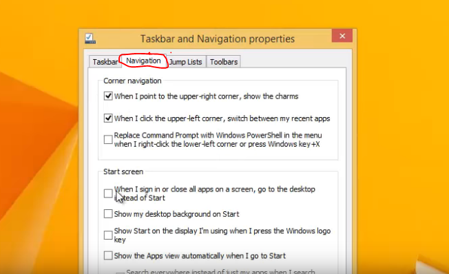 Look under the “Start Screen” option then tick the “When I sign in or close all apps on a screen, go to the desktop instead of Start”.