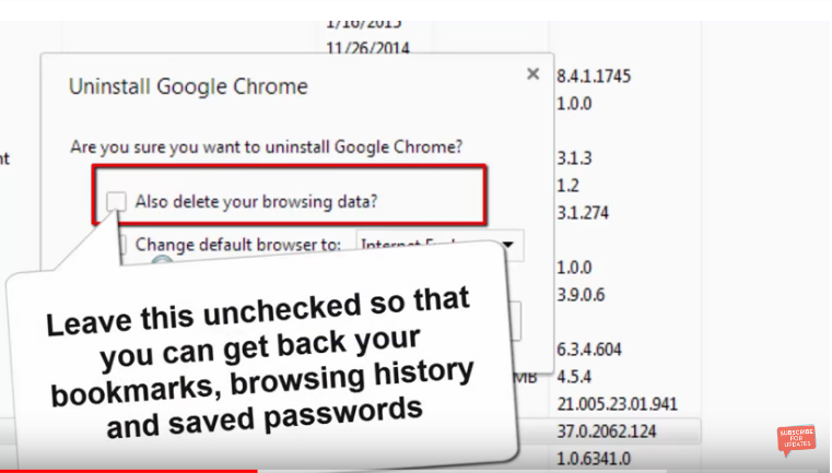 Now, during the uninstallation process, you will be asked whether you would like to delete browsing data; leave that unchecked because checking that will mean you will lose all your bookmarks, browsing history, saved passwords etc.