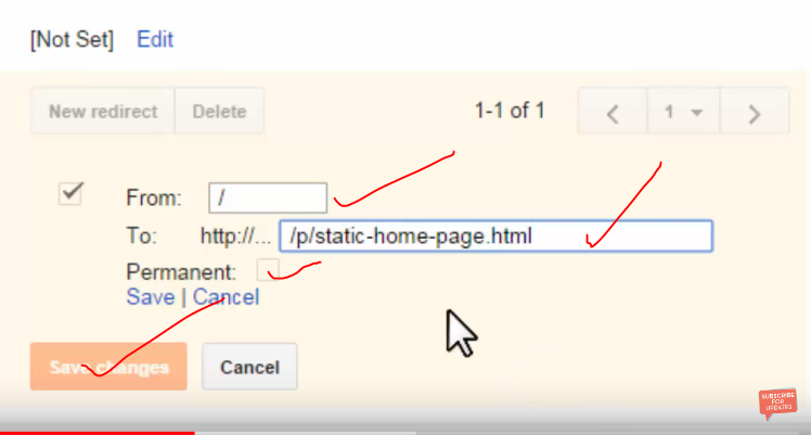 To create the static home page: Go to your dashboard, then “Settings/Search preferences/Custom Redirects/ and click on “Edit”.In the “From” box, type “/” that forward slashes without the quotes.