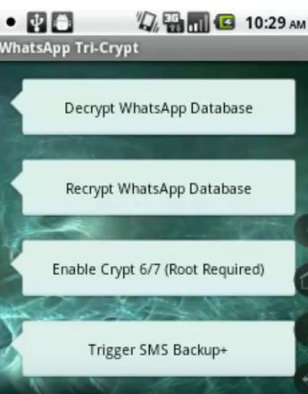 Touch/Click on the ‘Decrypt WhatsApp Database’. The app will automatically detect your database file on your SD Card and then decrypt it. The .crypt6 , .crypt7 or .crypt12 files will be decrypted to the form .db