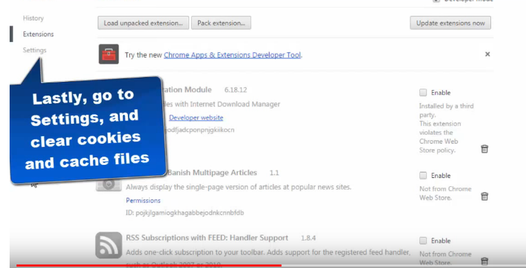 When you click on the extension, you should find “SaleepleuS” and “SalePlUs”. Remove all those extensions from your browser. Once you are done, go to “Menu”, then click on “Clear recent history”. A window will pop up, make sure to check only “Cookies” and “Cache”, and then click on “Clear now”. That’s all.